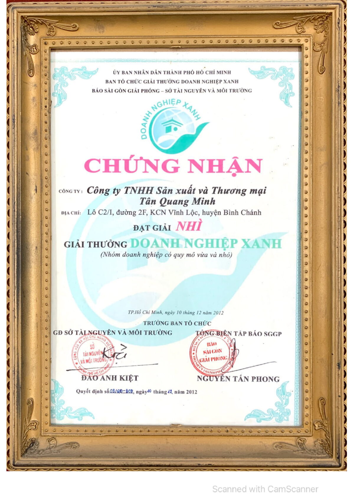 Công ty TNHH Sản xuất và Thương Mại Tân Quang Minh (Bidrico) vinh dự nhận “giải nhì giải thưởng doanh nghiệp xanh trong nhóm các DN có quy mô vừa và nhỏ”