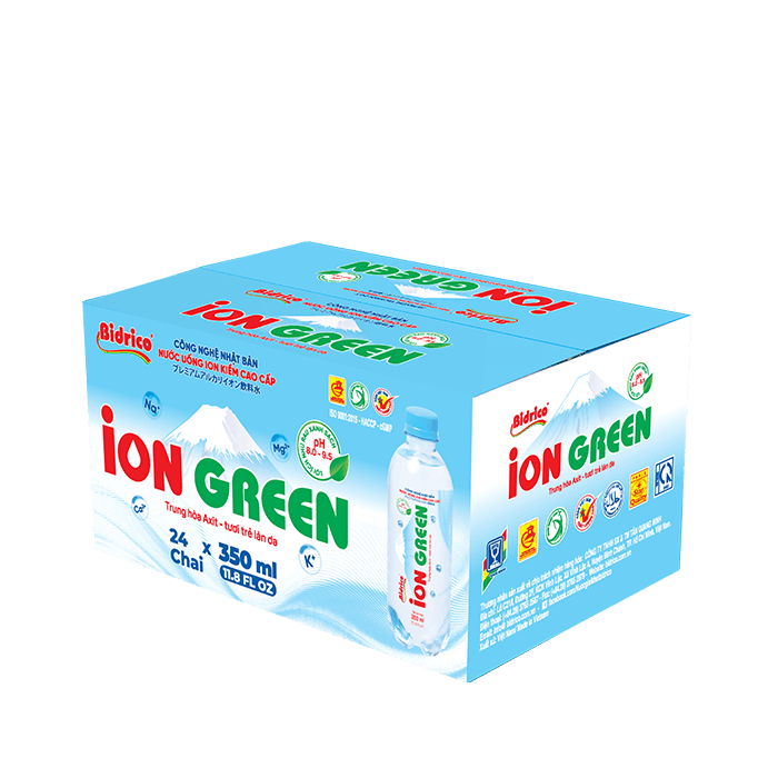 Nước uống ion kiềm cao cấp ION GREEN chai 350ml được tạo ra từ công nghệ điện giải, tách nước thành các ion H+ và OH-, có tính kiềm tự nhiên với độ pH khoảng từ 8.0 – 9.5. Sản phẩm được sản xuất trên dây chuyền tự động, khép kín, tích hợp công nghệ điện phân hiện đại từ Nhật Bản.